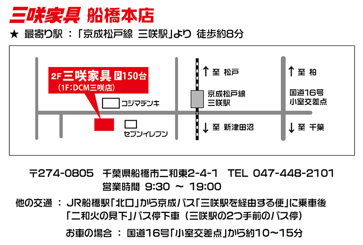 ◆ JR 船橋駅「北口」から京成バス「三咲駅を経由する便」に乗車約20分 「二和火の見下」バス停下車